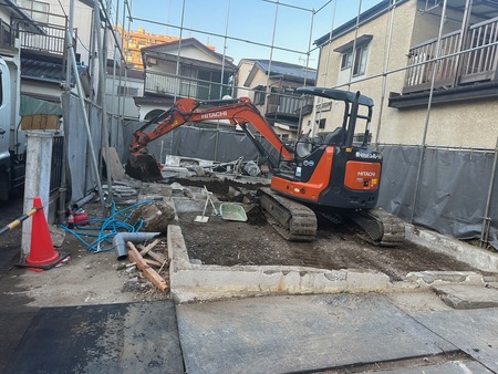 母屋・アパートの2棟、計72坪を施工させて頂きました。重機を敷地にいれる場所が無かった為、道路使用許可の通行止を申請し、ご近隣様30件程ご挨拶まわりをさせて頂きご近所様からもご協力頂ける様に努めて参りました。安全を第一にスムーズに施工できました。