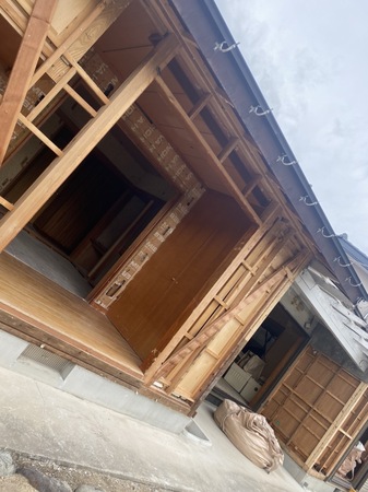 母屋は施主様が住んでいるため、お隣様の空き家の細い道を進み、山を削り、ブロック塀を壊し裏からの進入でとても難易度が高い現場でしたが、綺麗な状態で完工致しました。
