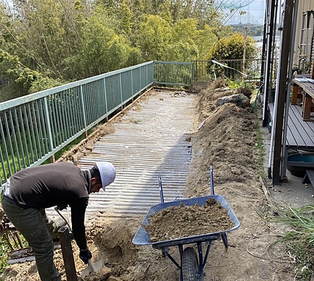 庭の半分が崖の上に鉄骨で造られた特殊な庭で土を取り除き腐った部分の鉄骨を解体・修理した後、土を戻す作業を行った。